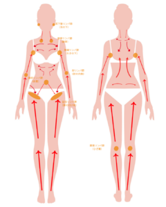 リンパマッサージはどの方向へ流すかが大切です。リンパマッサージはリンパの流れに沿って行うと言われていますが、これはリンパ節に向かってマッサージを行うことを指します。主要なリンパ節は図の通りです。リンパ節周辺は特に念入りにマッサージしたい箇所ですが、その際力をいれないように気を付けて行いましょう。摩るようにが優しく行うが基本です。