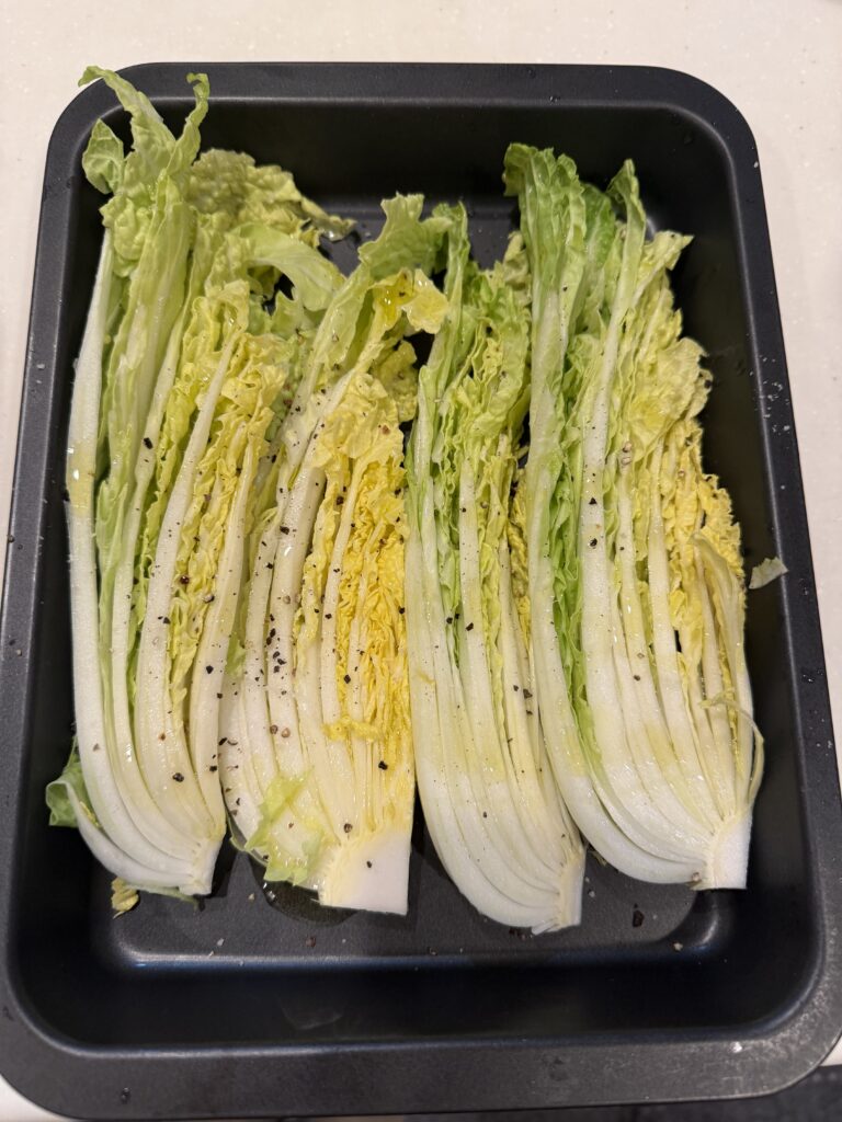 2 グリル皿(なればアルミホイル)に白菜を重ならないように並べて塩をふたつまみ程度とブラックペッパーを適量を振りオリーブオイル大さじ2~2.5 程度の量を全体に回しかけます。魚焼きグリルで強火で5分程度焼きます。オーブンを使用する際は鉄板に直接またはクッキングシートに並べて200~220度で5~7分焼きます。